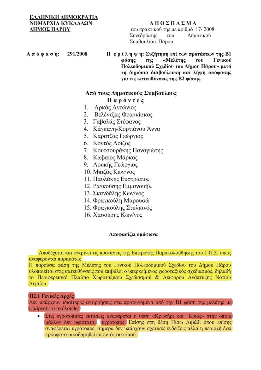 3. «Ξεχνά» ο κ. Μπιζάς ότι γνώριζε εξ αρχής ότι υπήρχαν αμφιβολίες για την ύπαρξη υγρότοπου στην περιοχή "Κρωτήρι και Κριός" πράγμα που και εκείνος ψήφισε κατά τη "Συζήτηση επί των προτάσεων της Β1 φάσης της «Μελέτης του Γενικού Πολεοδομικού Σχεδίου του Δήμου Πάρου» μετά τη δημόσια διαβούλευση και λήψη απόφασης για τις κατευθύνσεις της Β2 φάσης" (Απόφαση 291/2008 Δημοτικού Συμβουλίου, βλέπε συνημμένο)